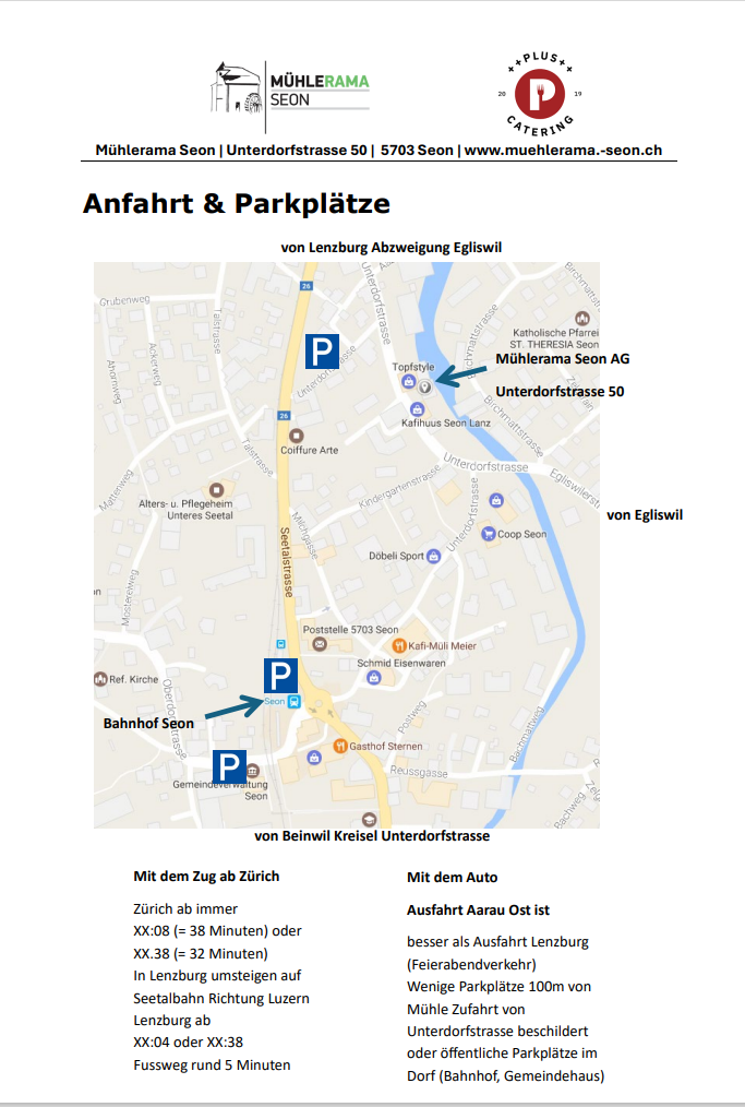 Wir feiern unsere freie Trauung im Mühlerama in Seon. Es kann sowohl mit dem Auto wie auch mit den öffentlichen Verkehrsmitteln erreicht werden. Da es an der Location nur begrenzte Parkplatzmöglichkeiten hat, bitten wir darum Fahrgemeinschaften zu bilden oder mit den öffentlichen Verkehrsmitteln anzureisen.
